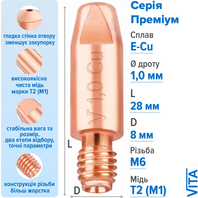 - Посилений наконечник зварювальний 1,0 мм E-Cu М6 D8мм/L28мм мідь Т2 (М1) для пальника MIG/MAG зварювального напівавтомата VITA